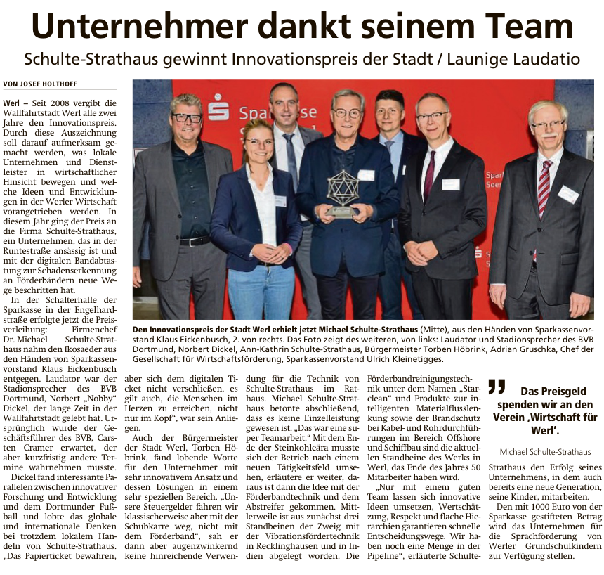Yesterday evening, we were delighted to receive the Innovation Award for Business from the city of Werl. The award went to our new STARCLEAN® Smart Scraper, which will be presented at this year's Bauma in Munich. The laudation was held by the "Hero of Berlin" and Borussia Dortmund legend Norbert Dickel. We would also like to thank the following people: Adrian Gruschka (head of the GWS business development agency), Mayor Torben Höbrink and Klaus Eickenbusch (Sparkasse board member).